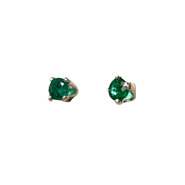 Sparkly little round faceted gemstones of translucent, deep green emerald are prong-set in sterling silver in these stud earrings. Posts.