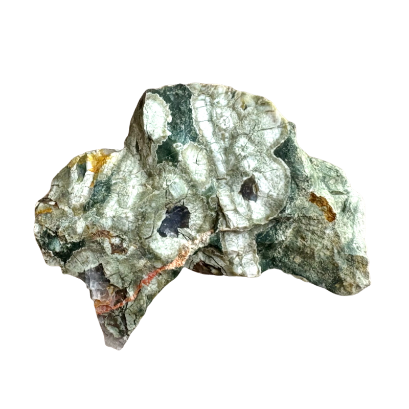 Rainforest jasper, from Mt Hay, Queensland, Australia. This stone isn't jasper at all, it's a volcanic rhyolite lava. The colorful patterning comes from silica and impurities lining and filling in the gas bubbles (vesicles) in the lava. This is old-stock rainforest "jasper" from the type locality.