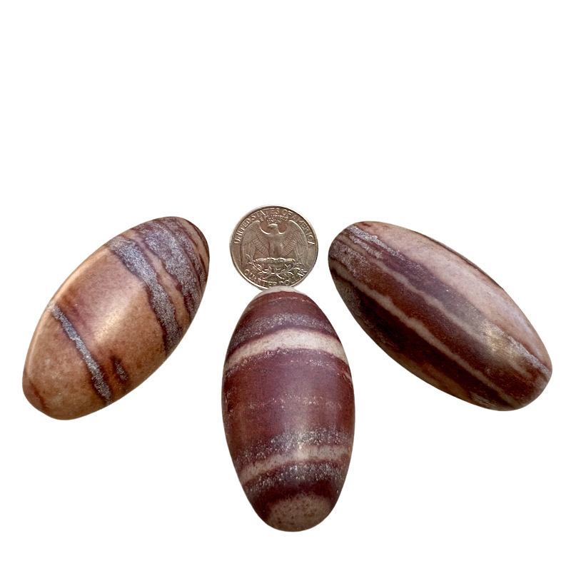 Shiva lingham (or "lingam") stones are egg-shaped stones from the Narmada River in India. They symbolize Lord Shiva's formless and infinite nature, as well as the union of masculine and feminine energies. They also represent the five elements and the cyclical nature of life, creating a sense of cosmic unity.