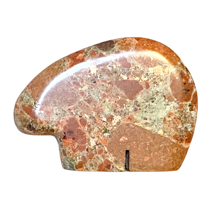 This bear shines in the right light! It's full of seams of native copper that have a metallic luster, in a matrix of reddish brown breccia.