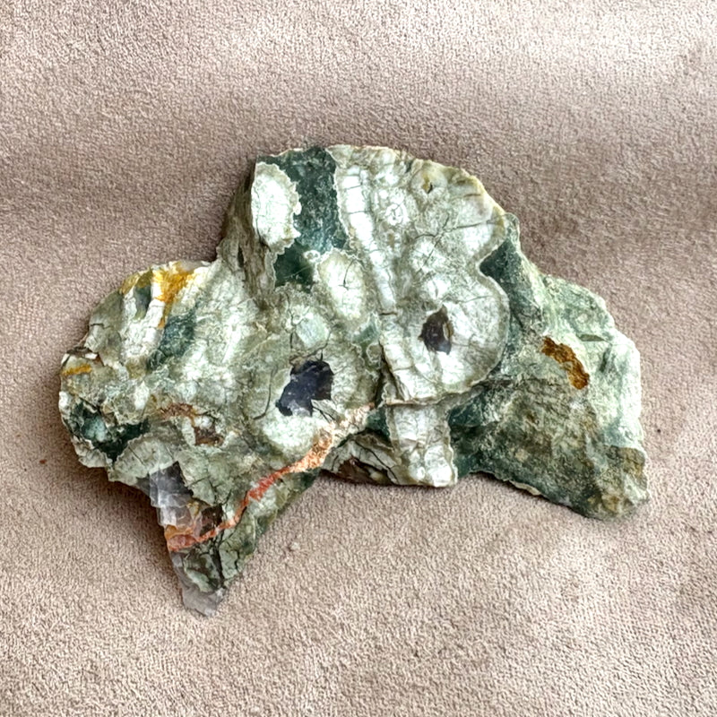 Rainforest jasper, from Mt Hay, Queensland, Australia. This stone isn't jasper at all, it's a volcanic rhyolite lava. The colorful patterning comes from silica and impurities lining and filling in the gas bubbles (vesicles) in the lava. This is old-stock rainforest "jasper" from the type locality.