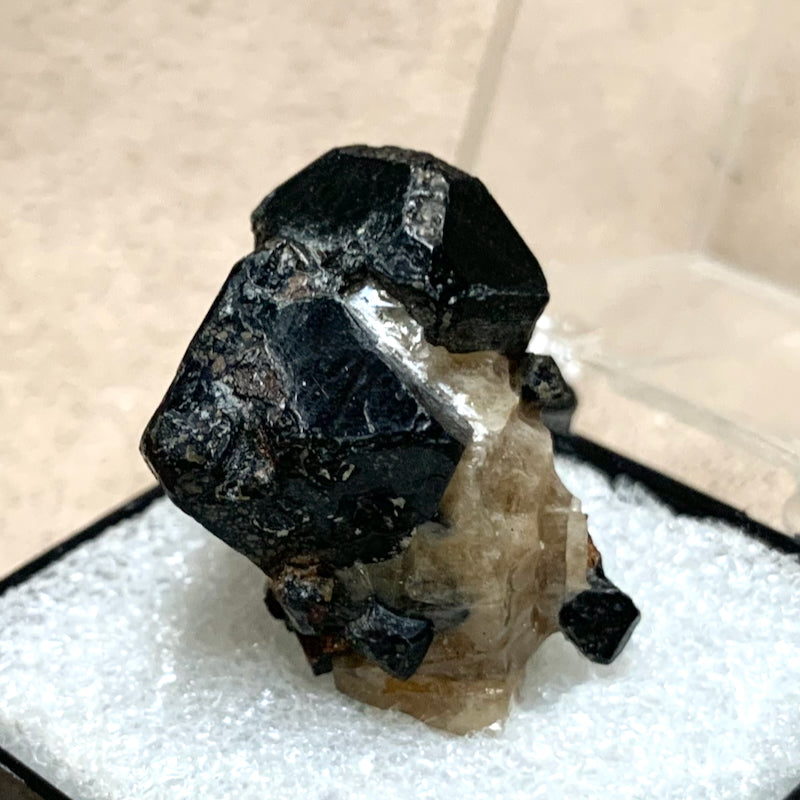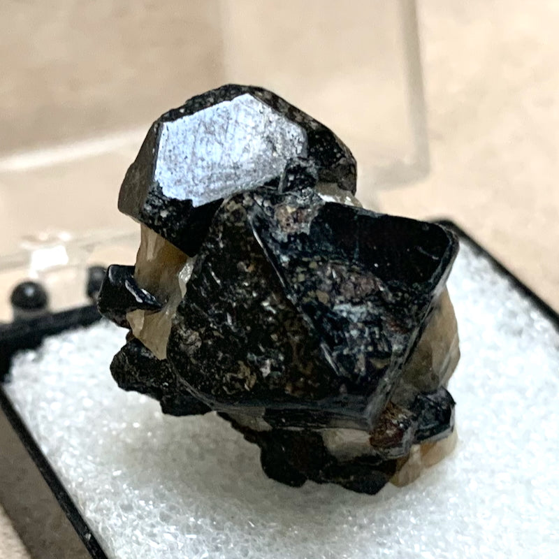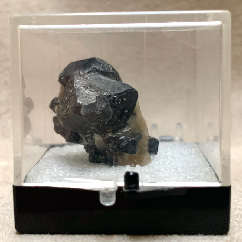 Spinel crystals, from Madagascar, presented in a Perky box. Spinel is a magnesium-aluminum oxide, usually found in igneous rocks.
