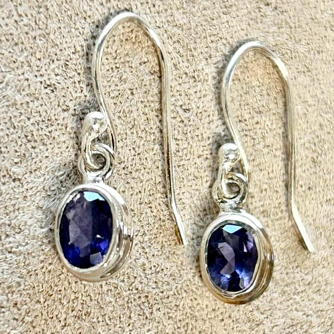 Faceted, oval iolite gemstones are bezel-set in sterling silver with open backs. Sterling silver ear wires.
