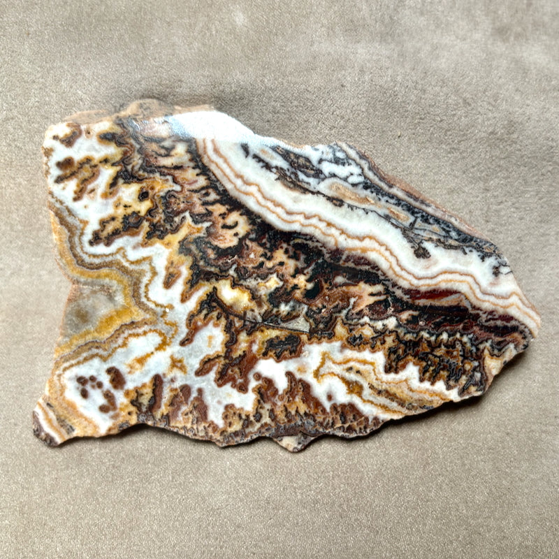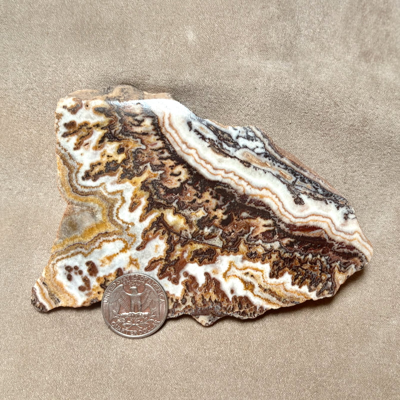 A beautiful piece of Mother Earth's art! The creamy onyx is banded in an intricate patterns of white, brown and black. The slab is polished on both sides.