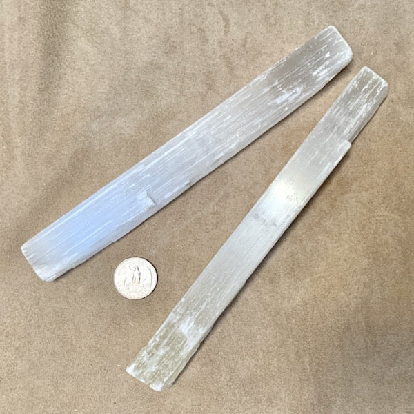 Gypsum (also known as "satin spar" gypsum) splits naturally to form sticks that are roughly square in cross-section. Sometimes these sticks are (incorrectly) called "selenite" wands. Selenite is another form of gypsum. Both are treasured for their ability to clear negative energies. Try giving yourself an energy "bath" by wiping yourself down with one of these wands!