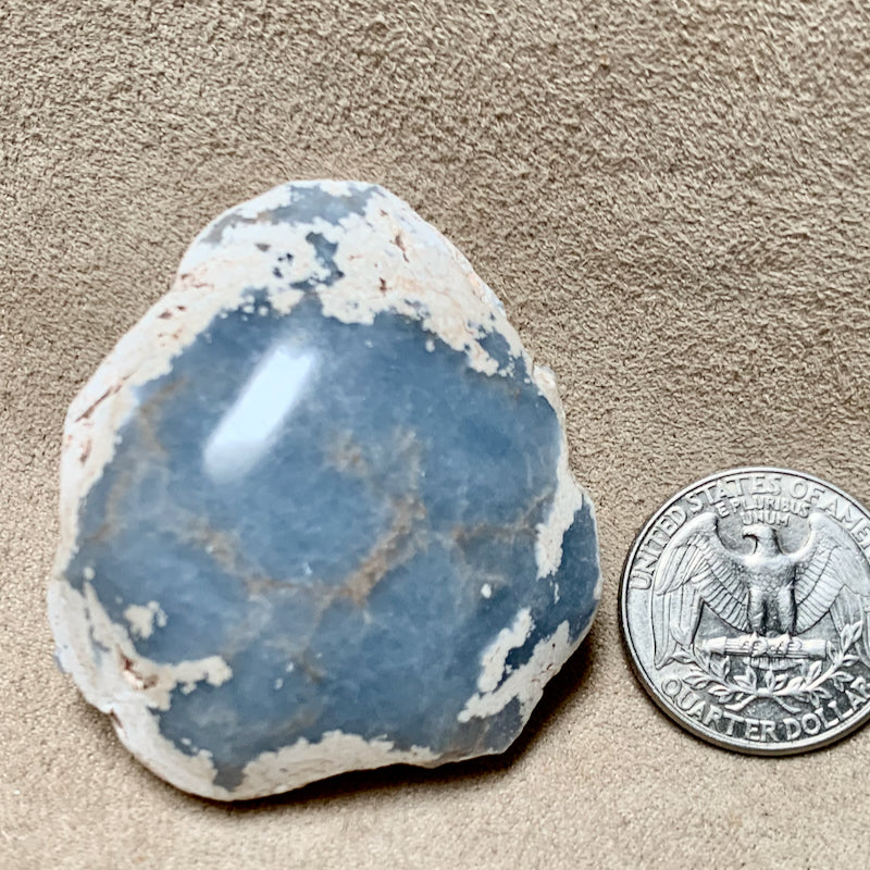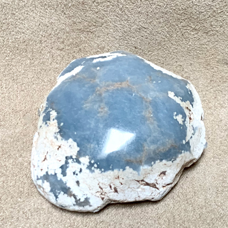 Classic light blue angelite, presented as a "window" - a top-polished piece that lets the beauty of the angelite shine through. Angelite is a trade name for a semi-transparent light blue-grey fine-grained anhydrite marketed as a gem material from Peru.