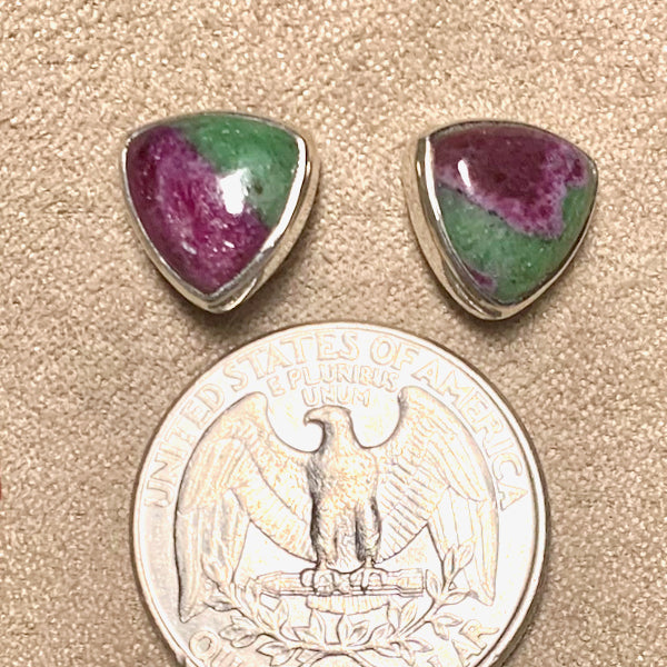 Polished triangular cabochons of ruby in zoisite (also known as anyolite) are bezel-set in sterling silver. Posts.