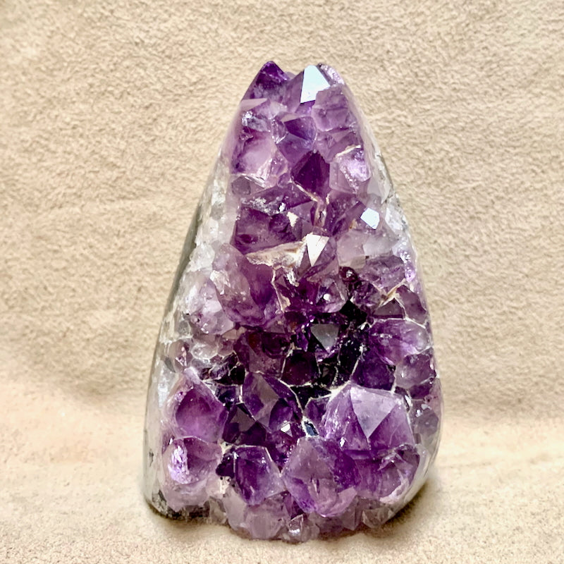 Medium-purple crystals of amethyst line the front of this amethyst geode standup. It is edge-polished, and has a flat, cut base. From Uruguay